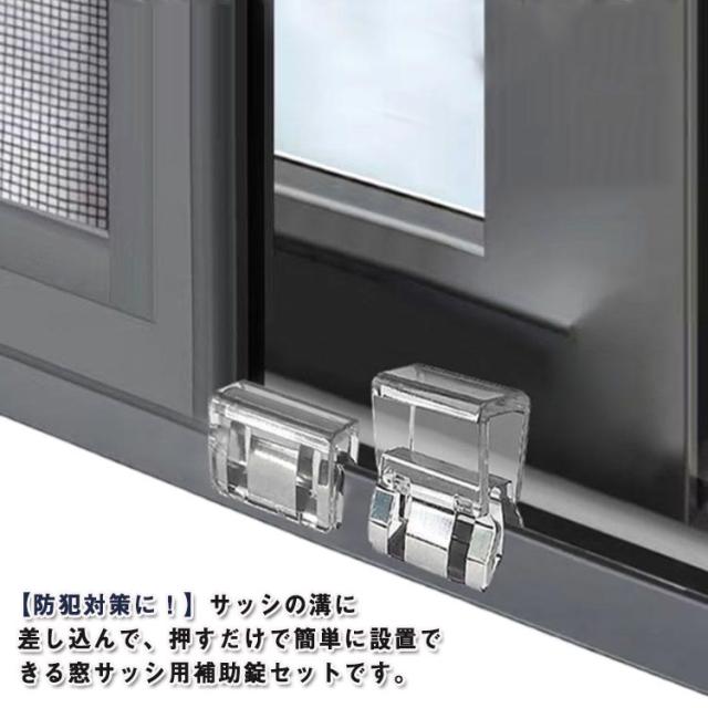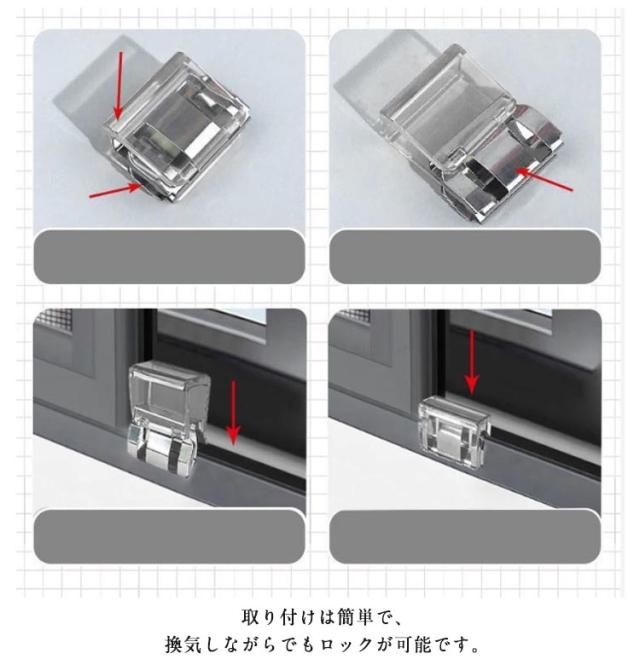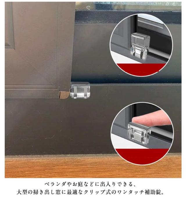 | 【防犯対策に!】サッシの溝に差し込んで、 押すだけで簡単に設置できる窓サッシ用補助錠セットです。 ベランダやお庭などに出入りできる、大型の掃き出し窓に最適なクリップ式のワンタッチ補助錠。 窓のサッシをしっかりロックして子供やペットを守る安心安全設計。 カギの開け閉めを覚えたばかりの小さなお子様のイタズラ対策や勝手に窓のカギを開けてしまう危険も防止。 取り付けは簡単で、換気しながらでもロックが可能です。 | |