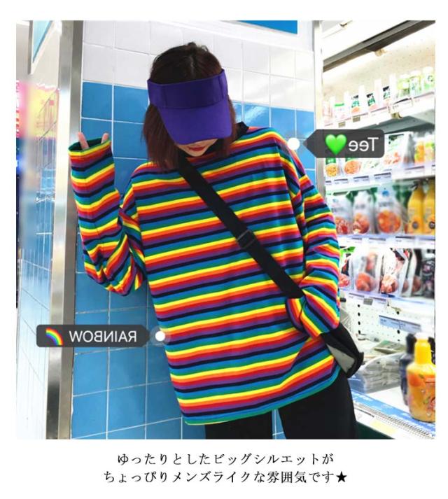 Tシャツ 長袖 送料無料 カットソー 送料無料 マルチボーダー柄 ヒップホップ レインボー トップス ダンス 衣装 ゆったり 韓国ファッション 個性的 服