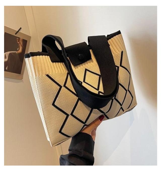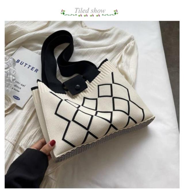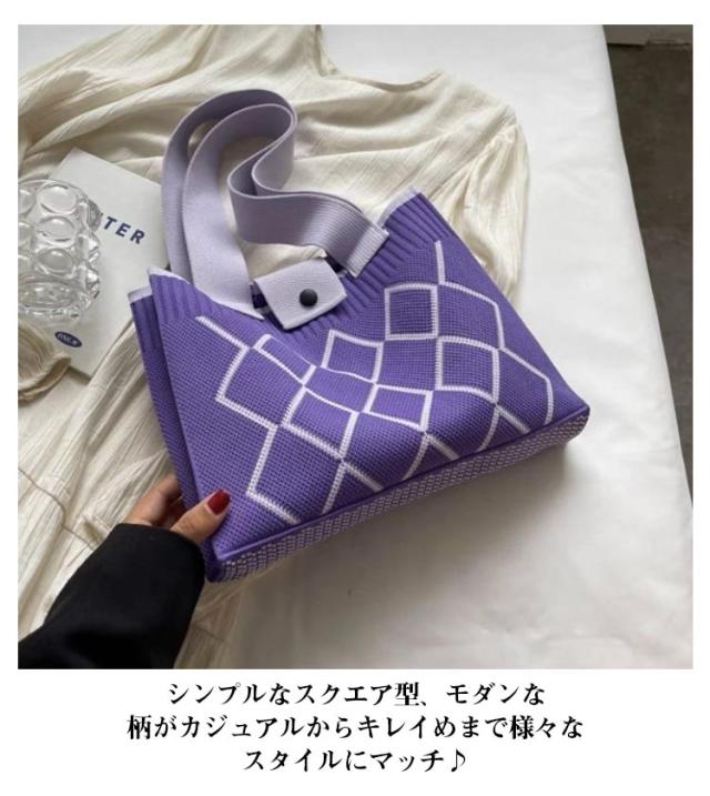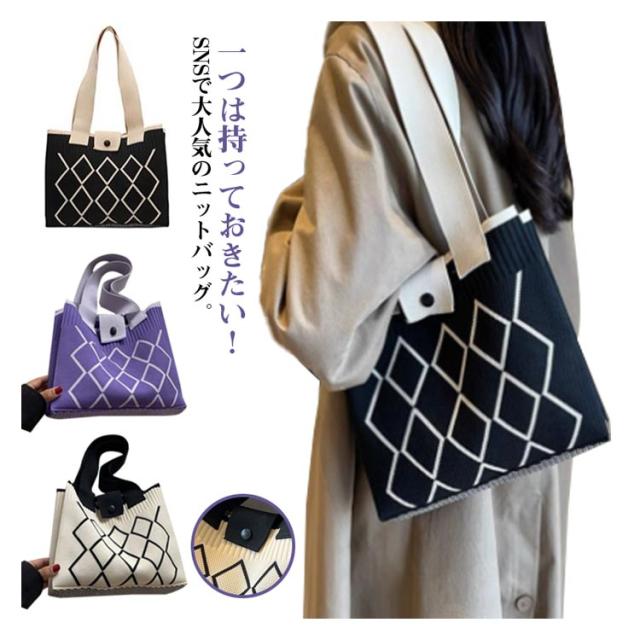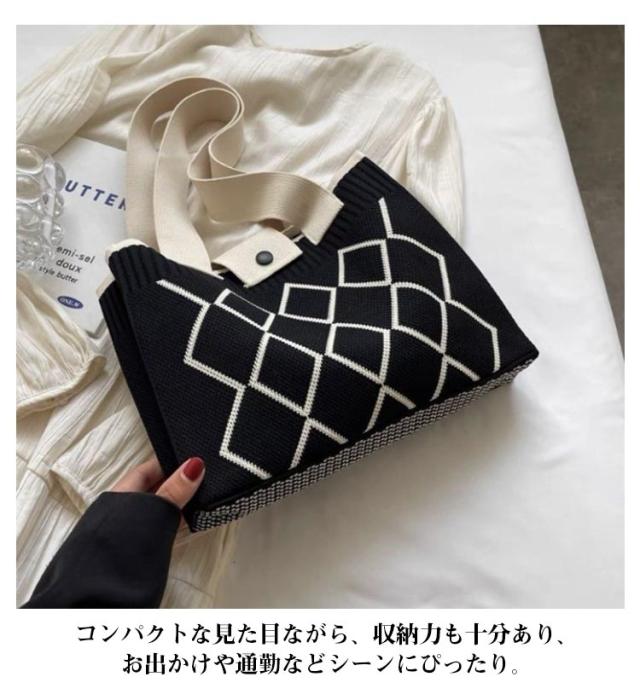 トートバッグ スクエアバッグ ワンショルダー 幾何学模様 ニット編みバッグ 肩掛けバッグ 鞄 レディース カバン 韓国 ハンドバッグ エコバッグ マチあり トートバッグ ミニトート ボタンで開閉 大容量 軽量 お出かけ 通勤