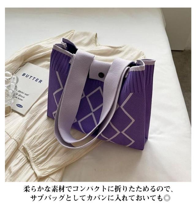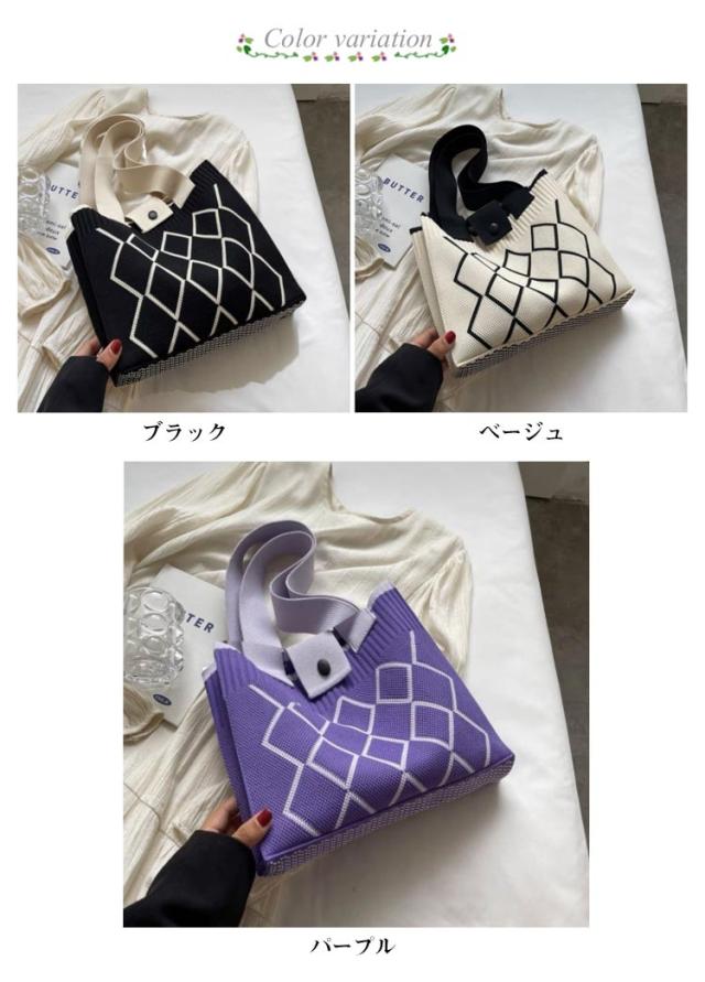 | 一つは持っておきたい!SNSで大人気のニットバッグ。 シンプルなスクエア型、モダンな柄がカジュアルからキレイめまで様々なスタイルにマッチ♪ コンパクトな見た目ながら、収納力も十分あり、お出かけや通勤などシーンにぴったり。 開閉はスナップボタンになっているから安心◎ 柔らかな素材でコンパクトに折りたためるので、サブバッグとしてカバンに入れておいても◎ | |