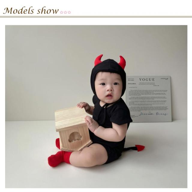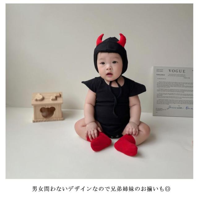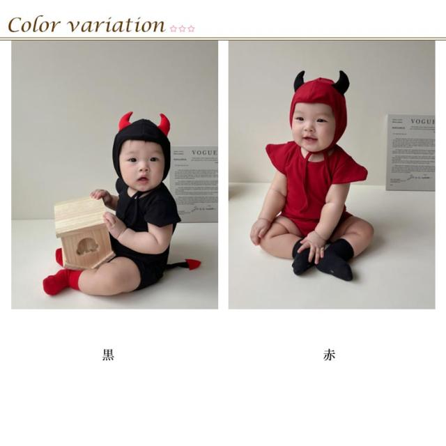 | とっても可愛い小悪魔ちゃんになれるロンパース♪ ぴょんと出る肩のデザインと帽子のツノ、さらにしっぽも付いていてキュート^^ 男女問わないデザインなので兄弟姉妹のお揃いも◎ 股下部分はスナップボタン式だから開閉ができて、お着替えも楽々です ハロウィンコスチューム、イベント仮装、遊 園、兄弟やお友達とおそろコーデ&リンクコ ーデ、お誕生日やクリスマス、記念日などの 写真撮影など様々な場面でご活用いただけます。 | |