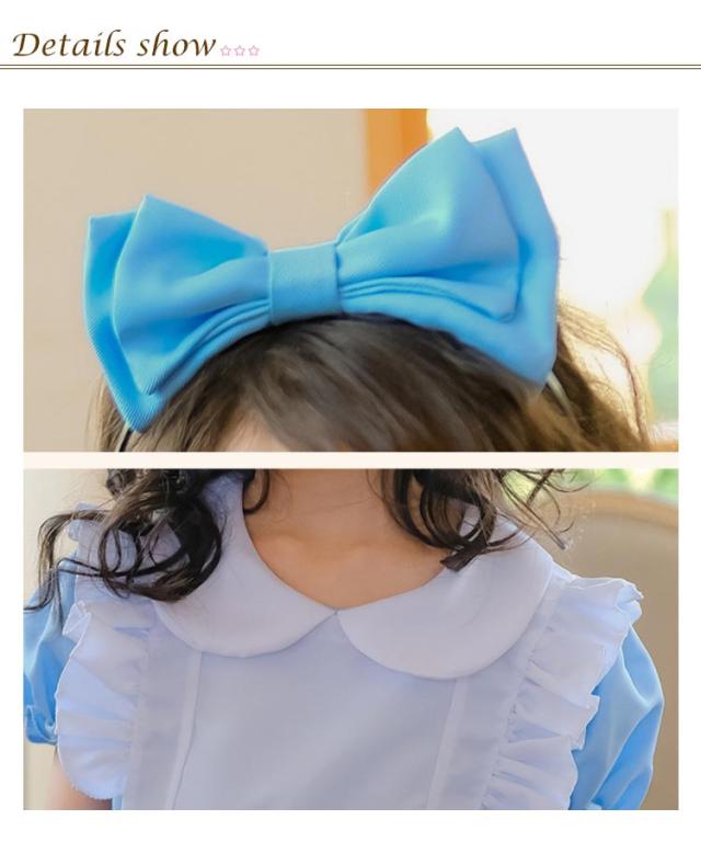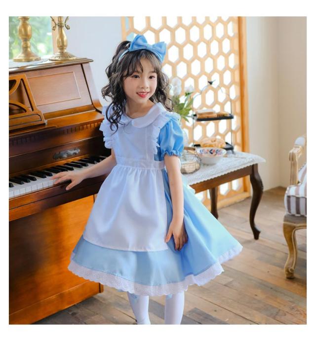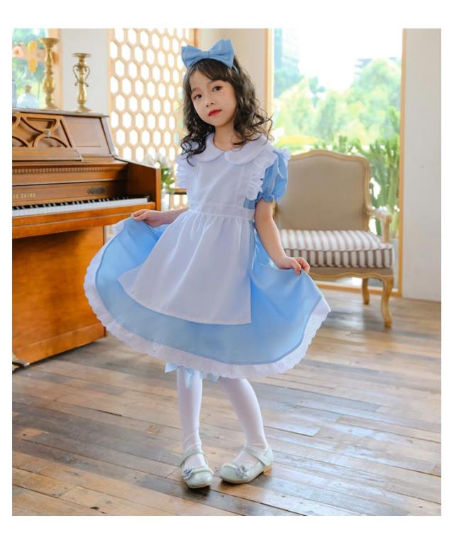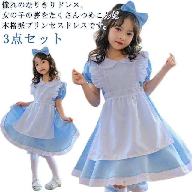 ハロウィン 半袖 可愛い ドレス エプロン 仮装 女の子 撮影 メイド服 キッズ 女児 衣装 コスプレ 文化祭 イベント 活動 子供 子供ドレス プリンセス なりきり ワンピース 水色 ライトブルー 3点セット 女の子 100-150cm