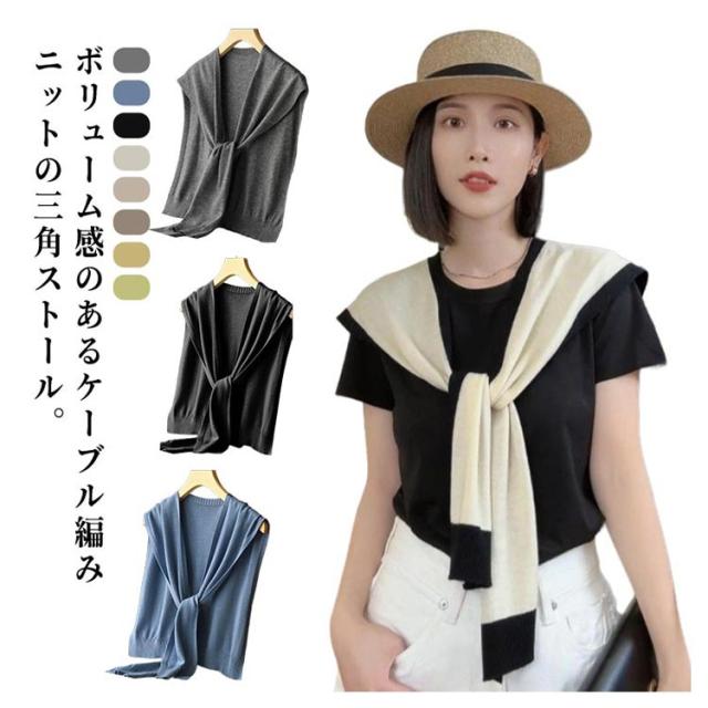 | ボリューム感のあるケーブル編みニットの三角ストール。 さっと羽織るだけでコーデに華やかなアクセントをプラスしてくれます◎ 柔らかいやや薄手のニット生地で、スカーフのような保温効果も備えます。 Tシャツ、ワンピースなど純色服に合わせてコーデのバリエーションを増やすのも簡単になります。 朝晩で気温が変わりやすい春や秋、夏のクーラーが効きすぎた部屋などの場合に特に活躍してくれます。 カラーバリエーション豊富でコーデの差し色として使える挑戦がしやすいファッション小物。 朝晩の肌寒いときや冷房が効きすぎるときにカーデを羽織れば防寒にも! | |