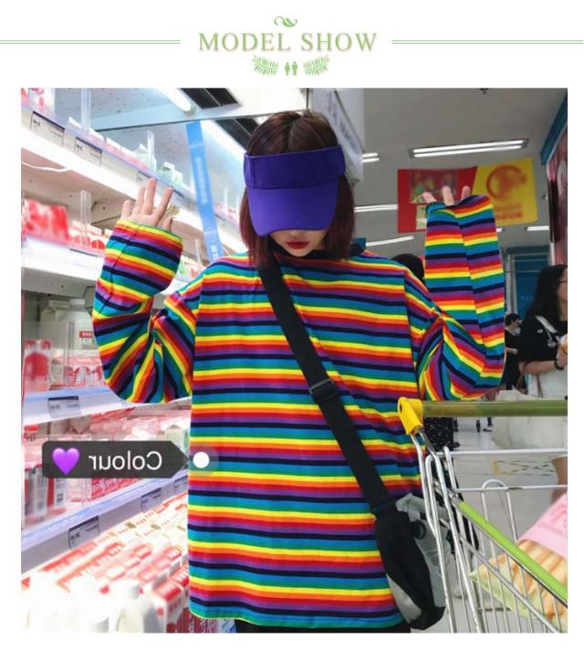 ゆったり Tシャツ 送料無料 長袖 カットソー レインボー カラフル 送料無料 トップス ダンス 衣装 ヒップホップ 韓国ファッション 個性的 服