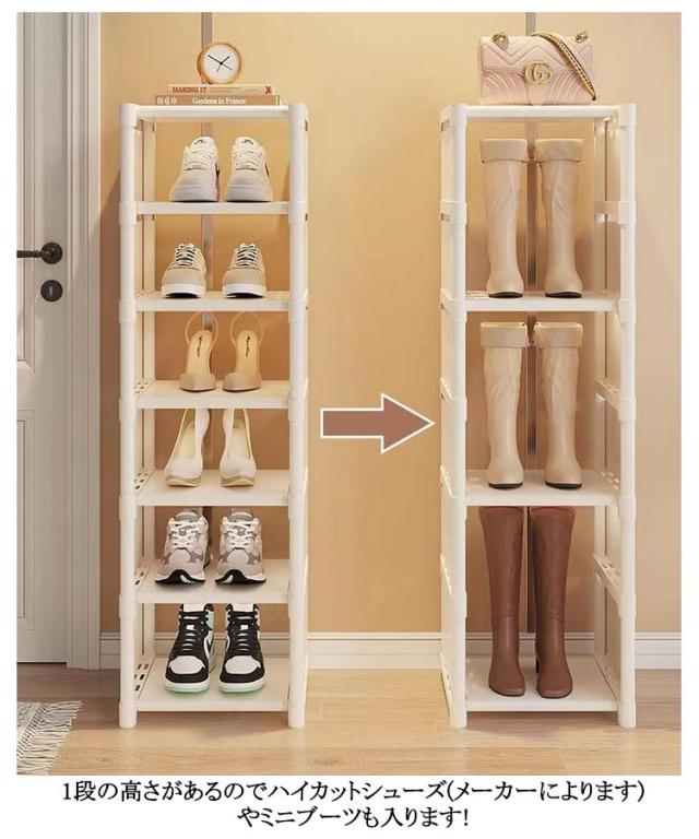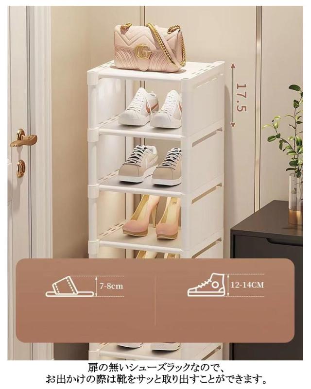 | 【スリム・省スペース6/7/8段シューズラック】 スチール製パイプで丈夫、安定したデザイン 奥行きは約30cmとスリムなデザイン 1段の高さがあるのでハイカットシューズ(メーカーによります)やミニブーツも入ります! 工具不要なので各パーツを差し込むだけで組み立てられます。 風通しが良いので、カビやニオイの原因となる湿気が留まりにくいのが特徴です。 扉の無いシューズラックなので、お出かけの際は靴をサッと取り出すことができます。 | |