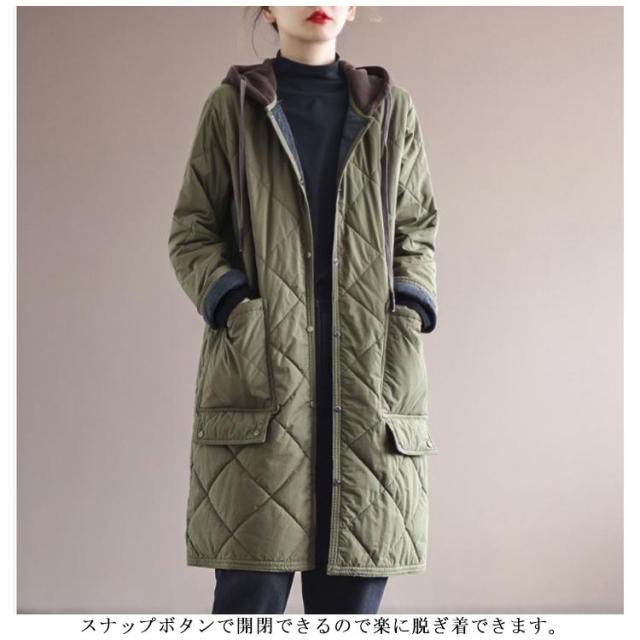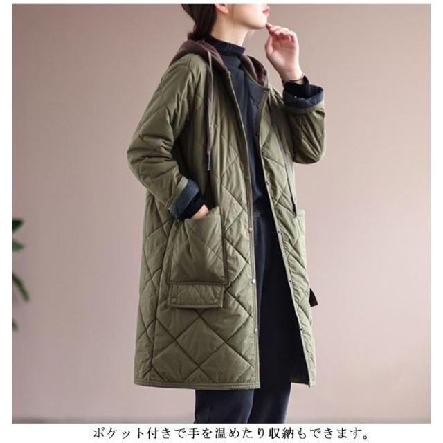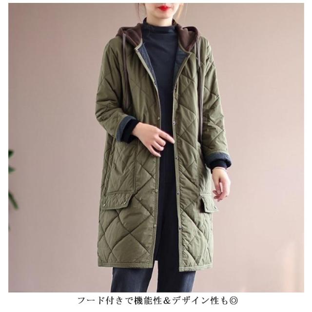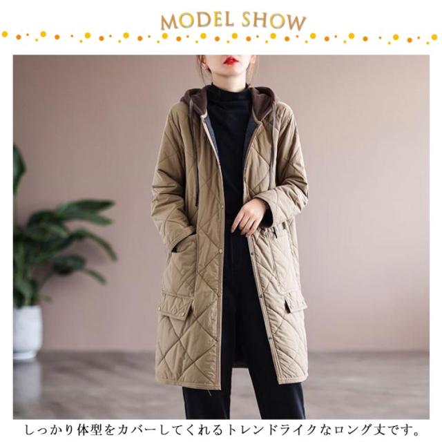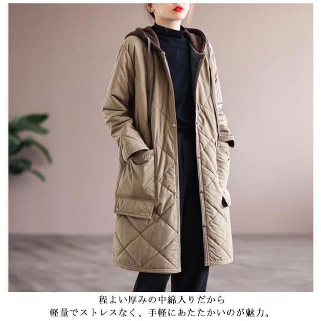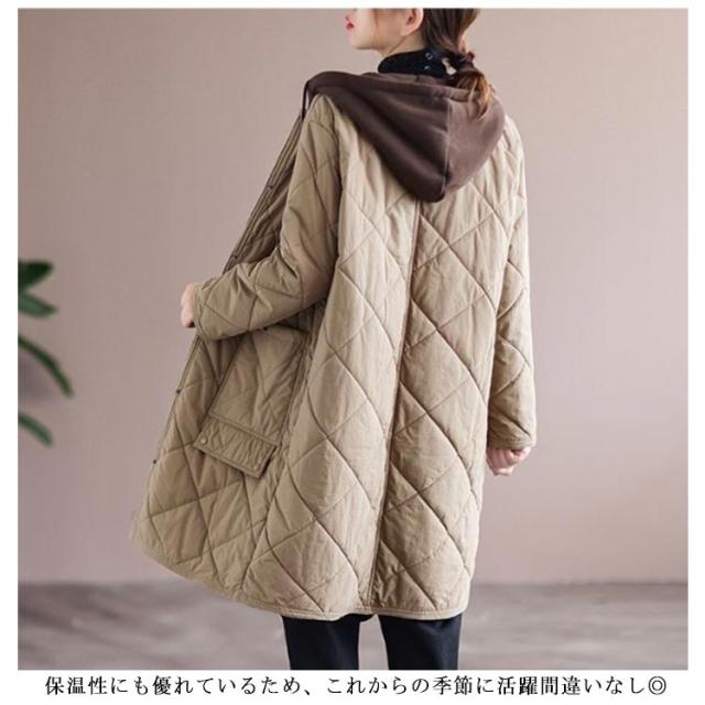 キルティングコート キルティング きれいめ コート 冬服 秋服 キルト 保温 ロングコート フードコート 防寒 30代 中綿コート 暖かい 中綿 あったか ロング丈 ゆったり 大人 レディース 20代 キルティングコート 40代 50代 キルティングジャケット カーキ ベージュ 黒
