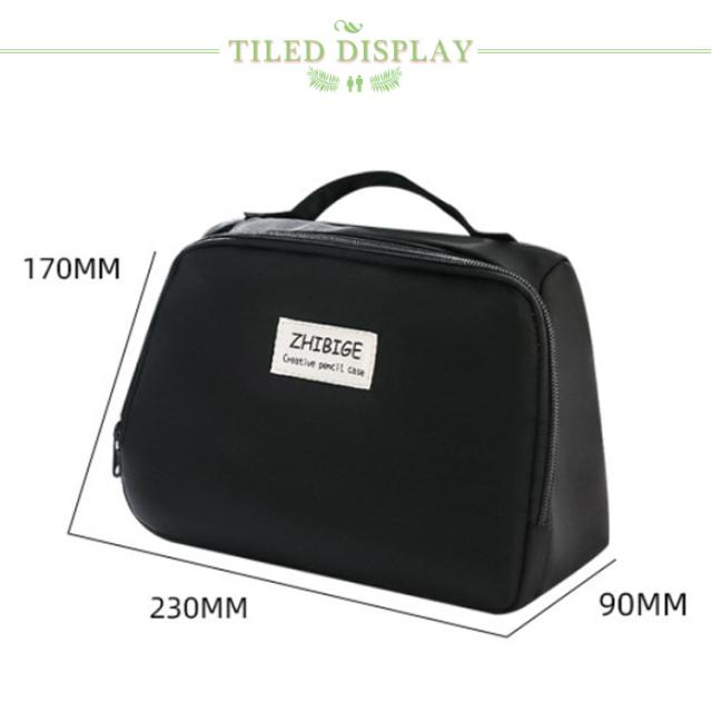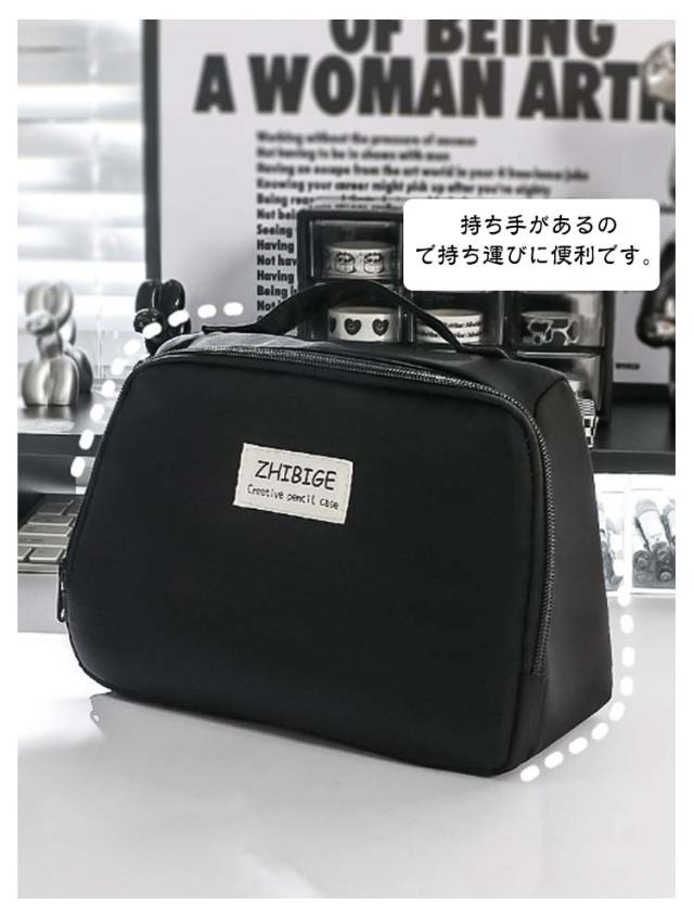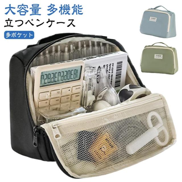 | 【立つペンケース】【大容量】【多機能】 文房具を立たせて収納するので、中身が一覧しやすく、机上で省スペースに使えます。 ぐるっと大きく開いて、いるものが見つけやすい。 小さな小物も見失わないメッシュポケット付き。 持ち手があるので持ち運びに便利です。 ペン、電卓、文具などのワークツールをまとめて収容して持ち運べるので、準備・片付けがしやすくなります。 | |