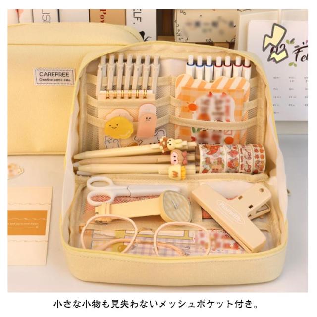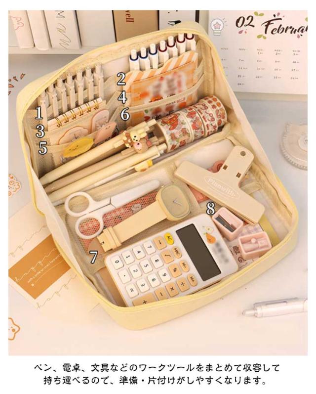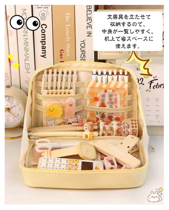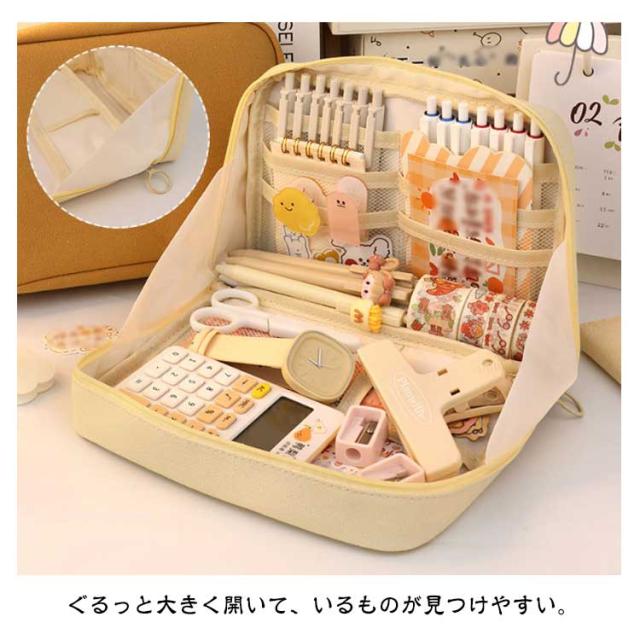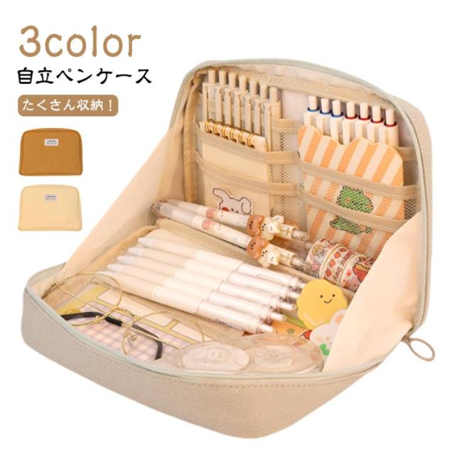 | 【自立ペンケース】【たくさん収納!】【3color】 文房具を立たせて収納するので、中身が一覧しやすく、机上で省スペースに使えます。 ぐるっと大きく開いて、いるものが見つけやすい。 小さな小物も見失わないメッシュポケット付き。 ペン、電卓、文具などのワークツールをまとめて収容して持ち運べるので、準備・片付けがしやすくなります。 女性には化粧ポーチとしても有効活用可能です。 | |