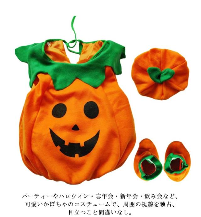 | かぼちゃの服+帽子+ソックス+バッグの4点セット! 【適応身長80-150cm 】 身に付けた瞬間カボチャに大変身!子供・キッズ・幼児用カボチャ服。 ふわふわぼわんなパンプキン姿がとってもキュート!ベビー・キッズ向けのジャックオーランタンのコスチューム! 上からかぶるだけだから簡単温度調節もしやすい、袖通しやすい、ソックスつきで足元までトータルコーディネート。ハロウィンのカボチャの模様が付き、ワンピーススタイルで気軽に着替えられます。 パーティーやハロウィン・忘年会・新年会・飲み会など、可愛いかぼちゃのコスチュームで、周囲の視線を独占、目立つこと間違いなし。 | |