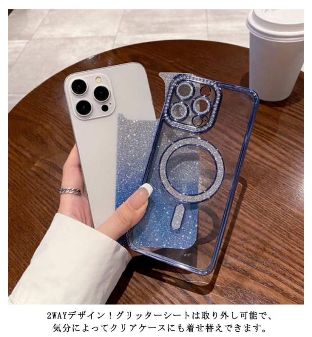 | 脱着しやすいTPUケース。丈夫で軽いTPU素材のソフトケースで、柔軟性が抜群です。 一体式カメラレンズ保護!傷や摩耗に強くカメラレンズを下向きに置いても傷が付きにくい、一体式なのでほこりの侵入も効果的に防ぐことができます。 2WAYデザイン!グリッターシートは取り外し可能で、気分によってクリアケースにも着せ替えできます。 MagSafe充電に対応!ケースを装着した状態でのMagSafe充電(マグセーフ)に対応しています。 | |