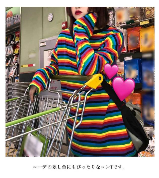 カットソー ヒップホップ ゆったり マルチボーダー柄 送料無料 Tシャツ カラフル 長袖 レインボー ダンス 衣装 送料無料 韓国ファッション 個性的 服