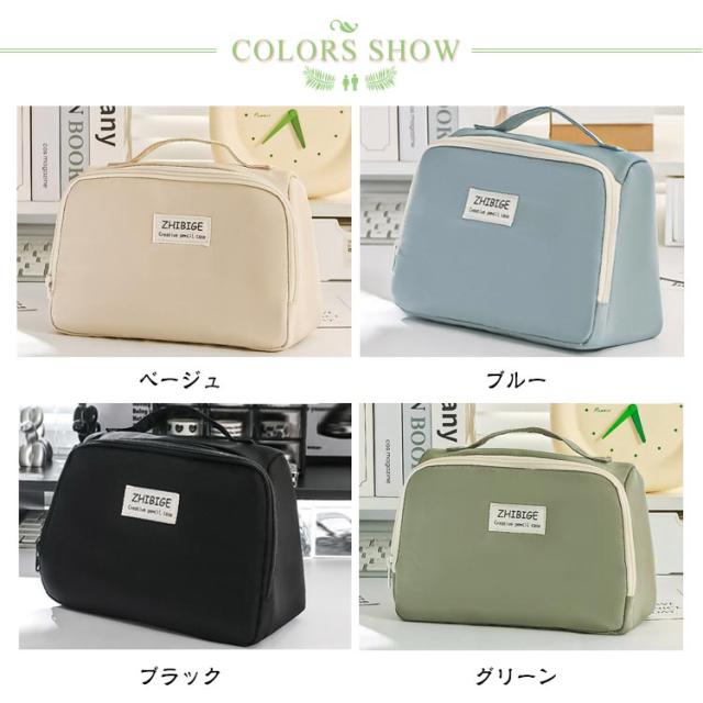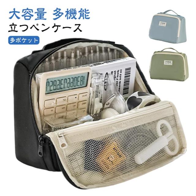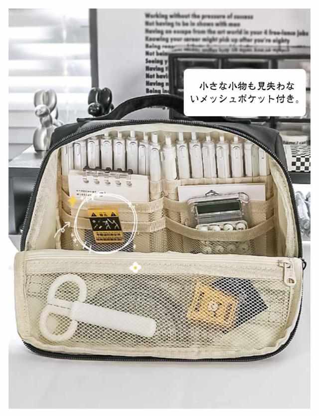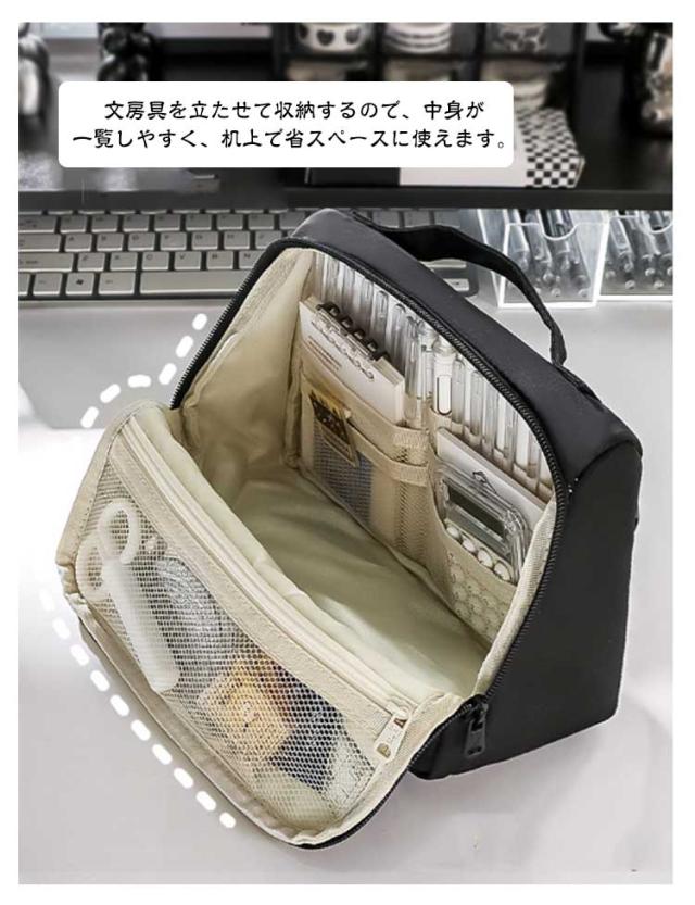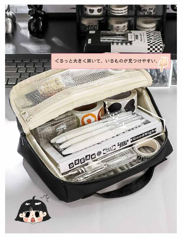 | 【立つペンケース】【大容量】【多機能】 文房具を立たせて収納するので、中身が一覧しやすく、机上で省スペースに使えます。 ぐるっと大きく開いて、いるものが見つけやすい。 小さな小物も見失わないメッシュポケット付き。 持ち手があるので持ち運びに便利です。 ペン、電卓、文具などのワークツールをまとめて収容して持ち運べるので、準備・片付けがしやすくなります。 | |