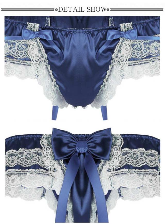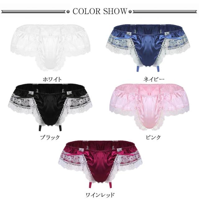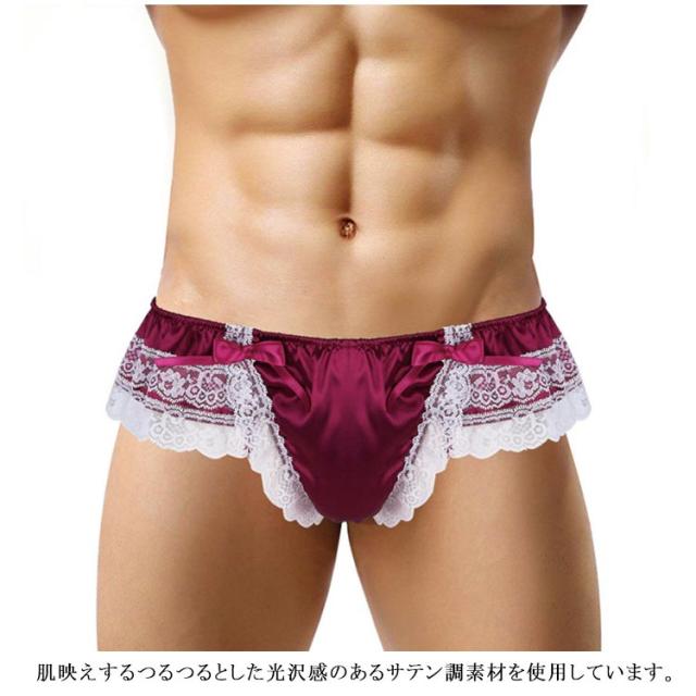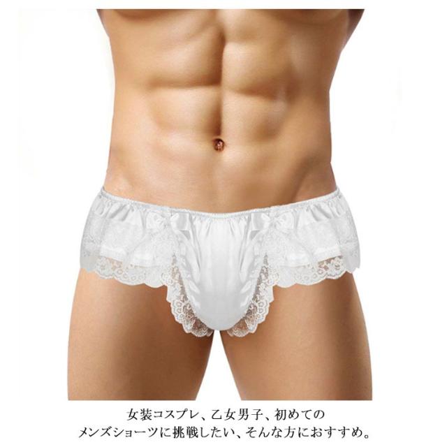 | 華やかなレースがフェミニンなメンズショーツです。 バックのリボンがポイント♪ 肌映えするつるつるとした光沢感のあるサテン調素材を使用しています。 女装コスプレ、乙女男子、初めてのメンズショーツに挑戦したい、そんな方におすすめ。 | |