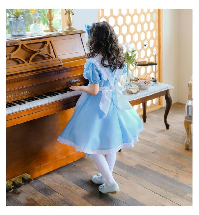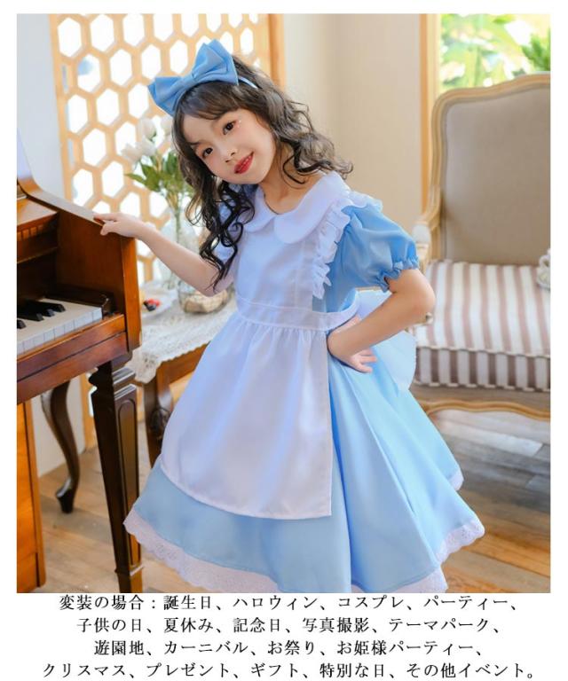 なりきり ハロウィン 萌え ドレス キッズ 女の子 コスプレ メイド服 子供 半袖 女児 仮装 可愛い エプロン イベント 活動 水色 文化祭 プリンセス 撮影 ワンピース 衣装 ライトブルー 3点セット 子供ドレス 100-150cm