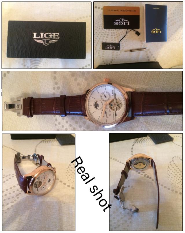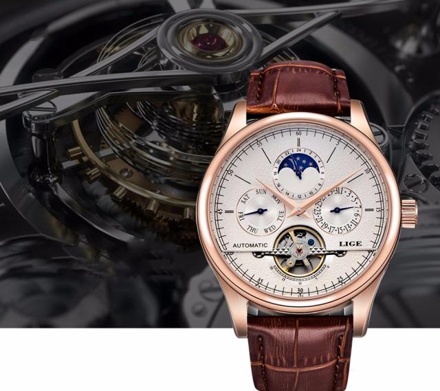 Lige男性時計自動機械式時計トゥールビヨン時計本革防水時計男性ミリタリー腕時計