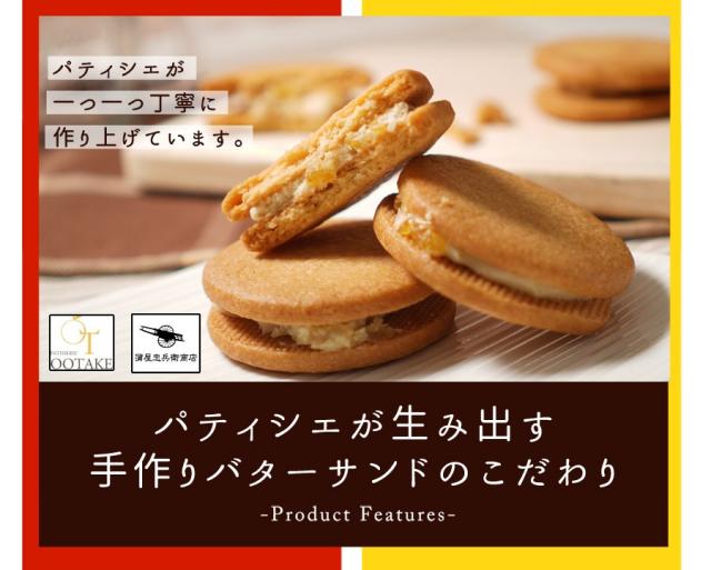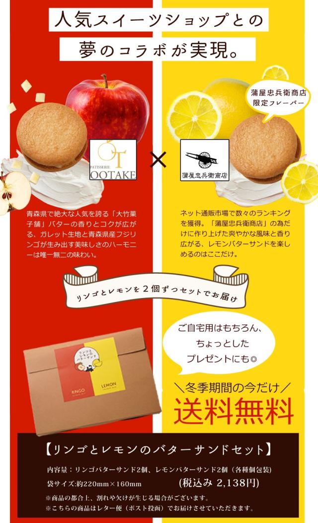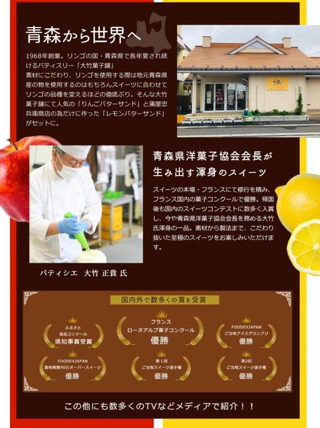 | 青森県で長年愛され続けるパティスリー大竹菓子舗が生み出珠玉のガレットバターサンドが誕生! サクサク食べ応え抜群のガレットクッキー生地に青森県産フジリンゴの蜜漬けをバタークリームにたっぷり挟んだリンゴのバターサンドと、ヨーロッパ産レモンの爽やかな香りを引き立てつつ当店だけでしか味わえないレモンのバターサンドをセットにしました。 |