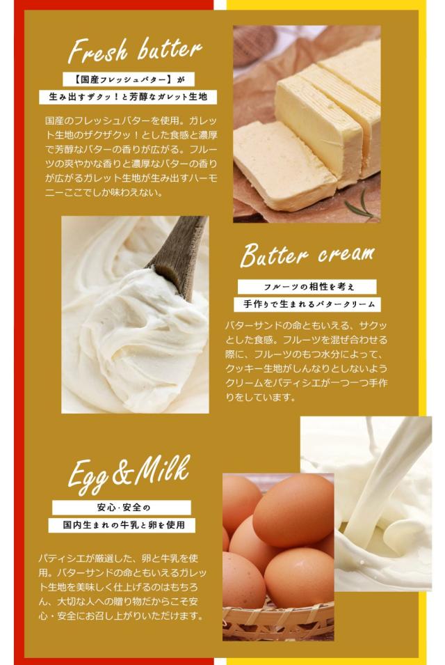 | 栄養成分表示 1個あたり/ | 【リンゴのバターサンド】熱量212kcal、タンパク質1.4g、脂質13.6g、炭水化物20.3g、食塩相当量0.2g 【レモンのバターサンド】熱量213kcal、タンパク質1.4g、脂質13.9g、炭水化物20.5g、食塩相当量0.2g |