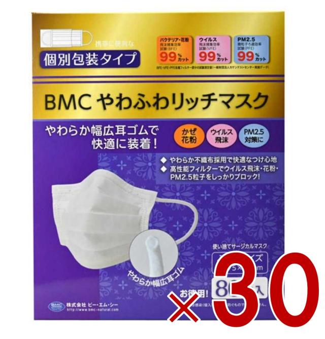 BMC やわふわリッチマスク ふつう 白 80枚 立体 サージカルマスク 不織布 大人用 個別包装 30個