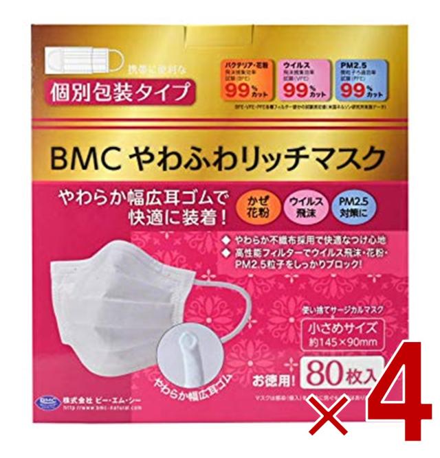 【23-29日限定 タイムセール】BMC やわふわリッチマスク 小さめ 80枚 サージカル 不織布 大人用 個別包装 4個