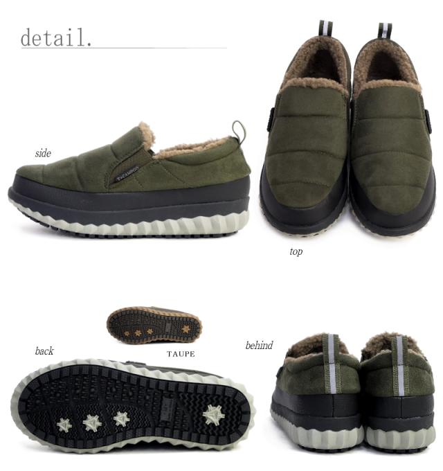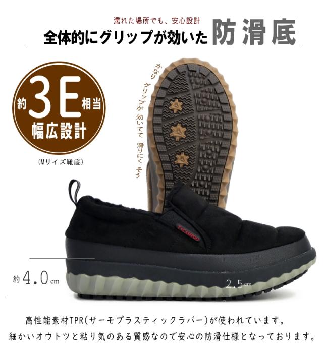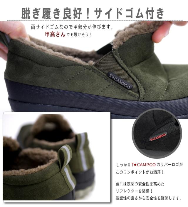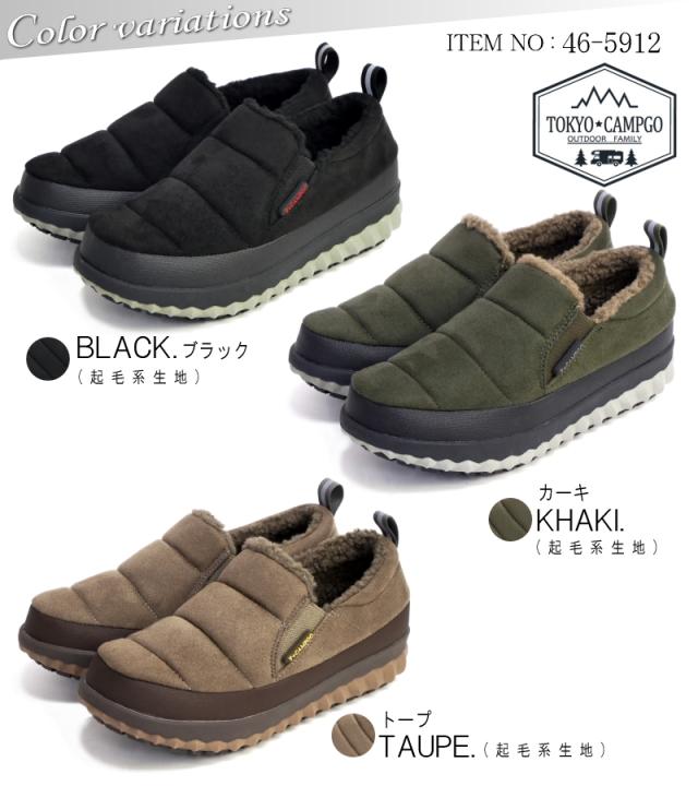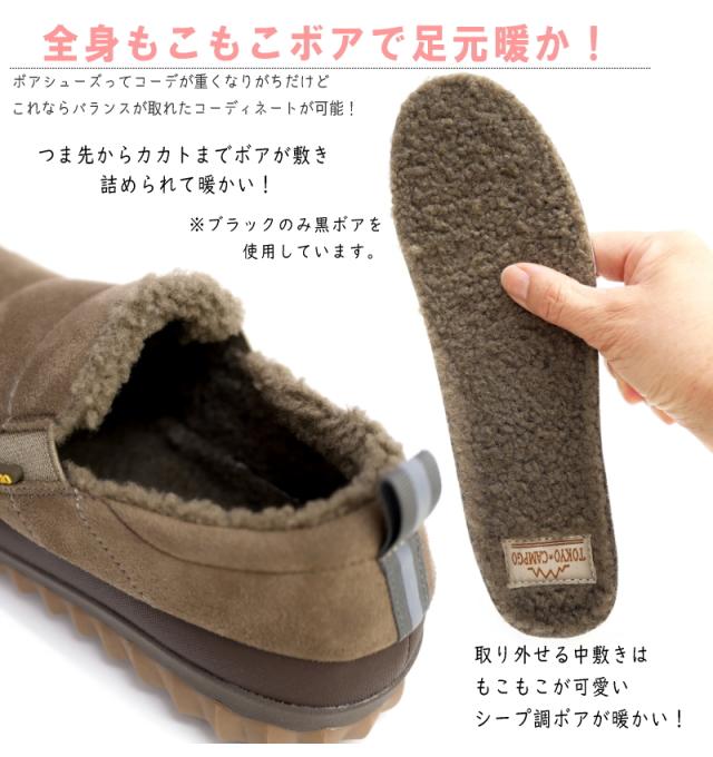 TOKYO★CAMPGO トーキョーキャンプゴー スリッポンシューズ レディース ボア モコモコ サイドゴム 防滑 暖かい 防寒 フラット 防水 アウトドア 黒 カーキ トープ 軽量 3e 屈曲