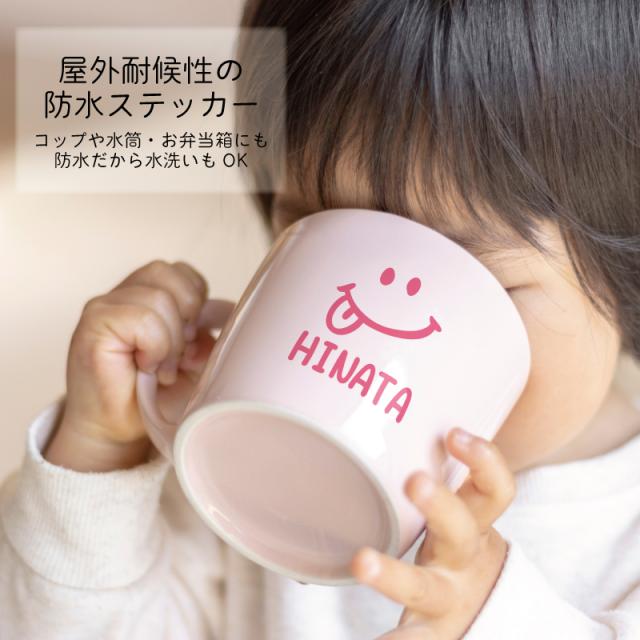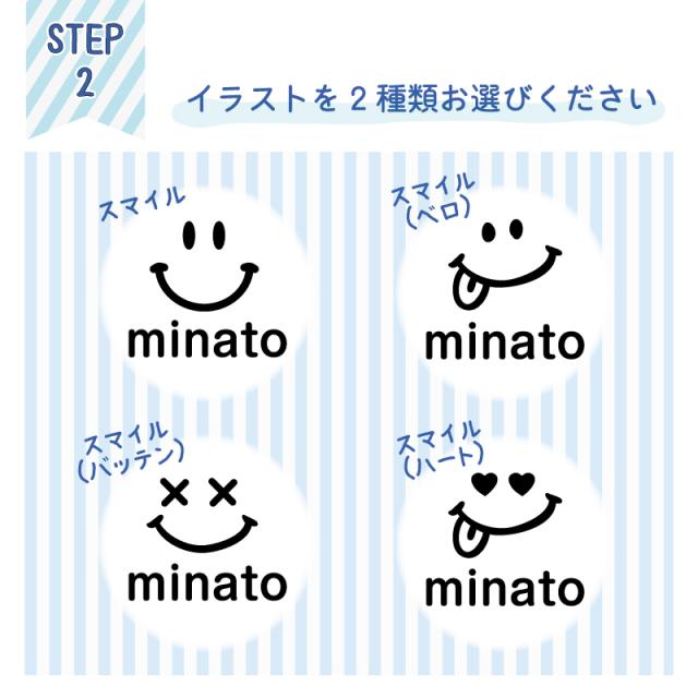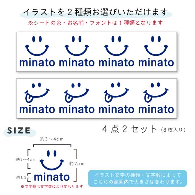 お名前ステッカー (スマイル)4点2セット 8枚入り お名前シール おなまえシール ネームシール 防水 耐水 お昼寝布団 幼稚園 保育園 小学校 上履き 帽子 服 はっきり 名入れ オーダーメイド ネームステッカー 入園準備 自転車 水筒 お弁当箱 コップ にこちゃん スマイリー