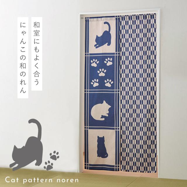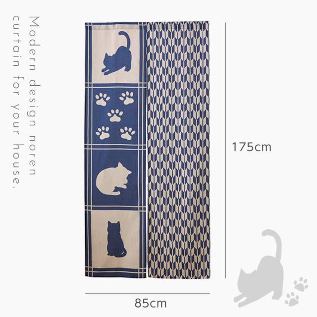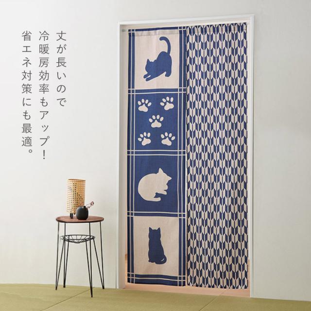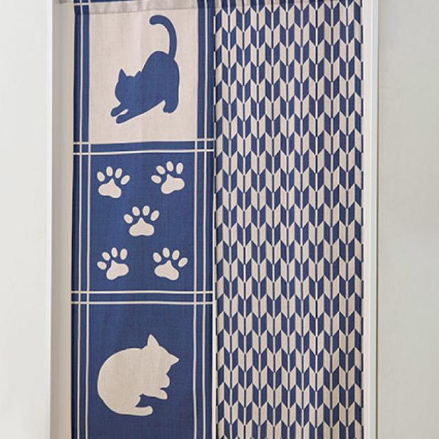 にゃんこの足跡とシルエットが可愛らしい和風ロングのれん。お部屋の間仕切りにも使えるロングサイズの、のれん。