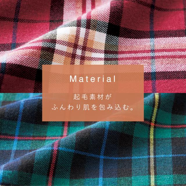 優しい着心地の起毛の綿混素材。ゆったりリラックスタイムに。生地の表側には細かな起毛加工。なめらかな肌触りで、体を優しく包み込みます。