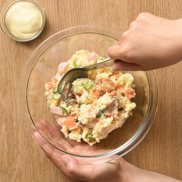 つぶして、混ぜて、盛り付けできる『マッシャーフォーク』これ一本でできるのでポテトサラダ作りが簡単に!