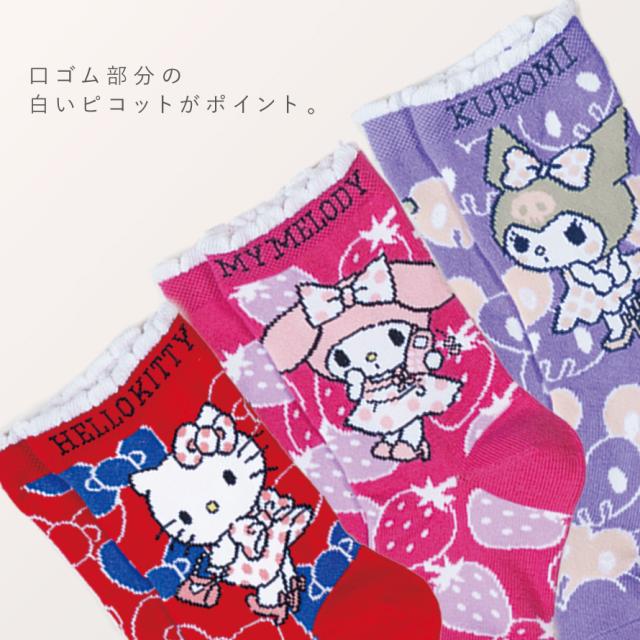 サンリオキャラクターのハローキティ、マイメロディ、クロミのクルー丈ソックス。キャラクターのイメージに合わせたカラフルな色合いで、お洋服のアクセントにも。可愛いサンリオキャラクターズのプリントは、お子さまも進んで身支度しそう。