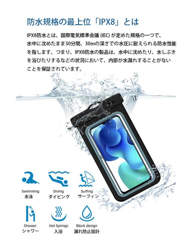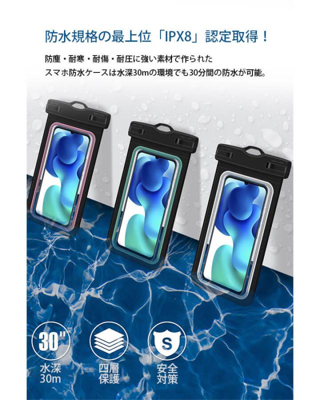 ■取扱商品の特徴: スマホ防水ケース スマホケース 防塵 防寒 対傷 耐圧 アウトドア 海 釣り 潜水 お風呂 温泉 海岸 砂浜 ぬれない プール スマホ 防水ケース ストラップ付 クリップ 回転式 便利 かわいい 全機種対応 水遊び ワンタッチ開閉 らくらく 超高透明 PVC素材 IPX8完全防水 水中撮影可能 防水深度30メートル TPUケース 夏を楽しむ F ブラック 黒 ブルーグレー 青 紺 灰 グリーン 緑 ミントグリーン 黄緑 薄緑 ピンク 桃 ホワイト 白 zak10