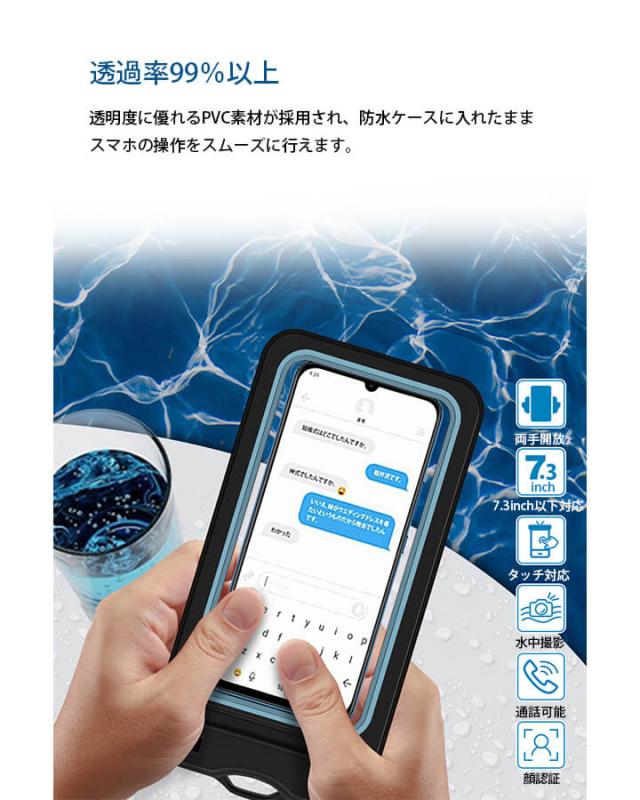 透過率99%以上、透明度に優れるPVC素材を採用し、防水ケースに入れたままスマホ操作を行えます。