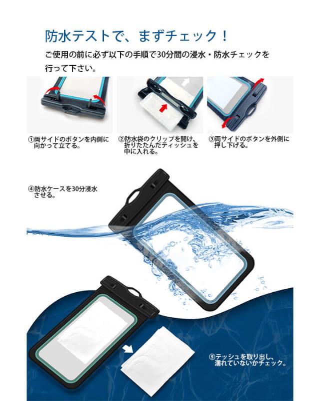 ※ご使用の前に必ず携帯の代わりに一枚の紙を防水ケースに入れて、水に浸して30分間の防水試験を行ってください。