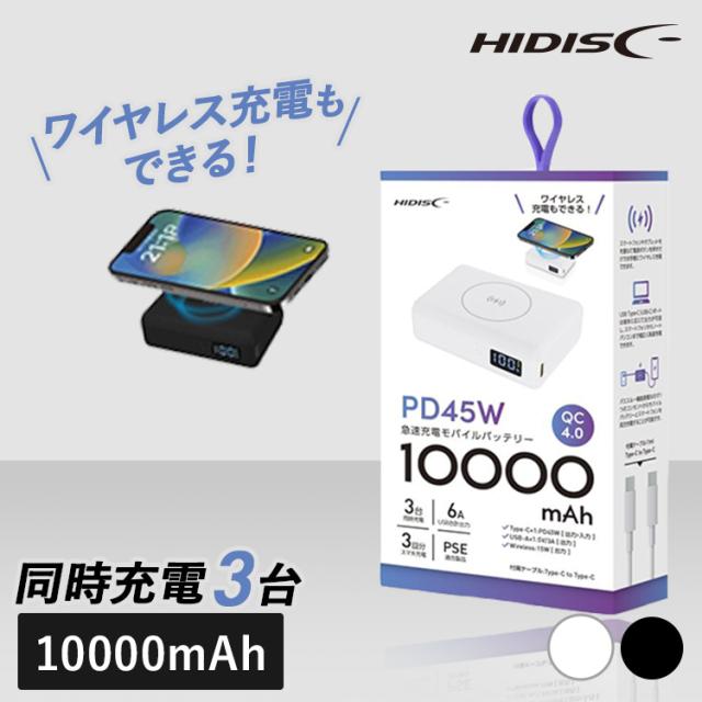 (検索用:モバイルバッテリー 大容量 iPhone タイプC 急速充電 iPhone対応 10000mAh PD45W対応 HIDISC ハイディスク 正規品 3台同時給電 USB-A type-C スマホ 4984279862193 4984279862186)