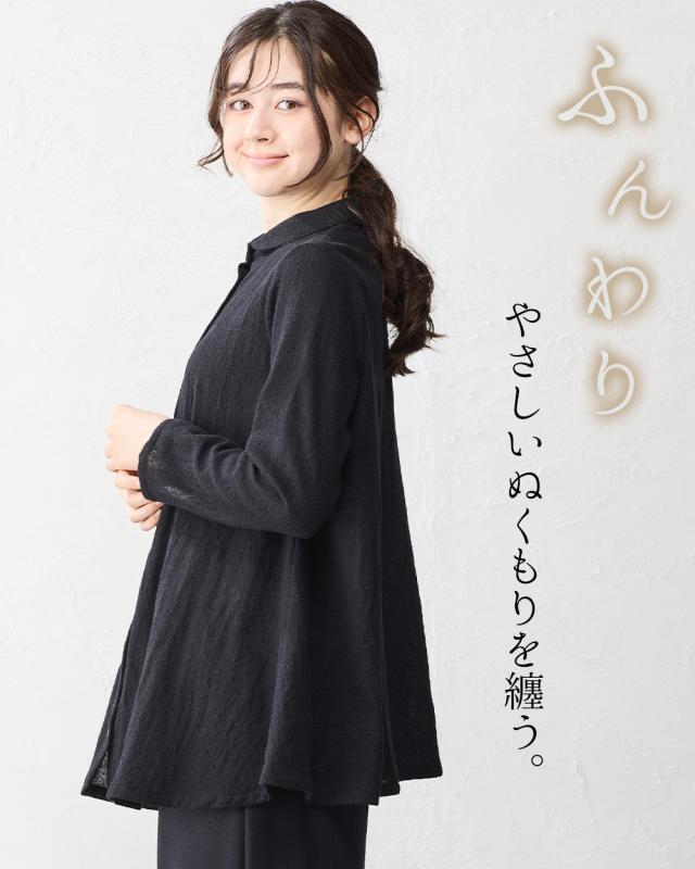 優しい肌触りと通気性の良さが心地よく、独特のしぼ感が立体的で自然な表情を生み出します。程よい保温性も備え、季節の変わり目や旅行、お出かけにもぴったりの一枚。