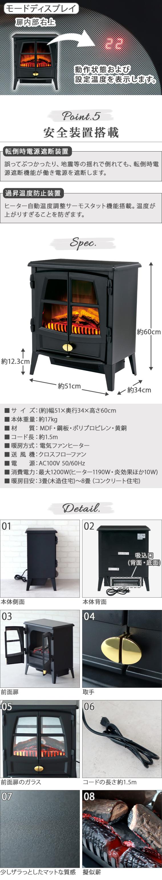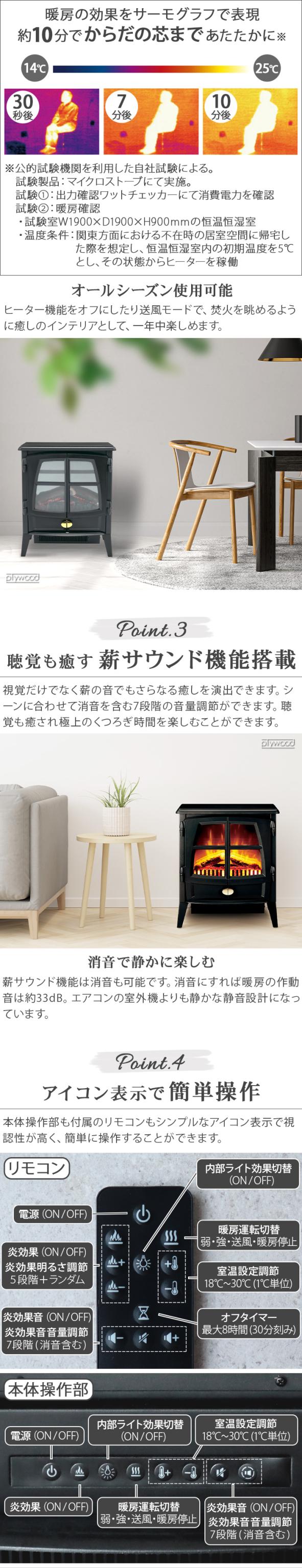 | 炎効果の調整(強-弱):1-5段階+ランダム 効果音(薪の爆ぜる音):OFF-6の7段階 オフタイマー:最大8時間(30分刻み) 温度調節機能:18℃-30℃まで(1℃単位で設定可能) |