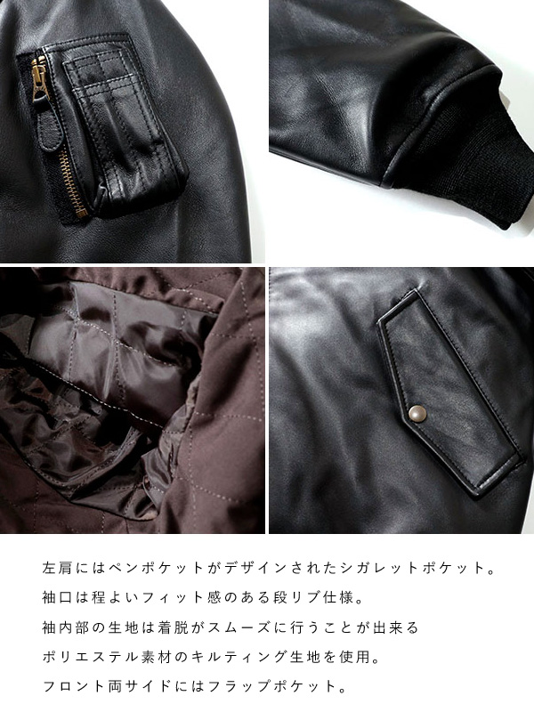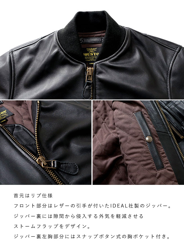 HOUSTON ヒューストン レザー MA-1 ラムレザー ●送料無料 ミリタリーウェアの中でも高い知名度を誇るMA-1フライトジャケットに、柔らかなシープレザーを使用。