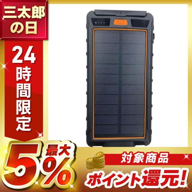 ソーラーパネル搭載で、緊急時にはソーラー充電も可能。通常は、10000mAh、2台同時充電可能の大容量。