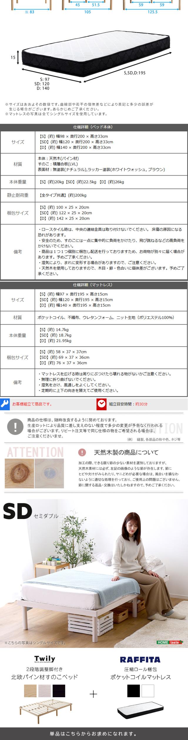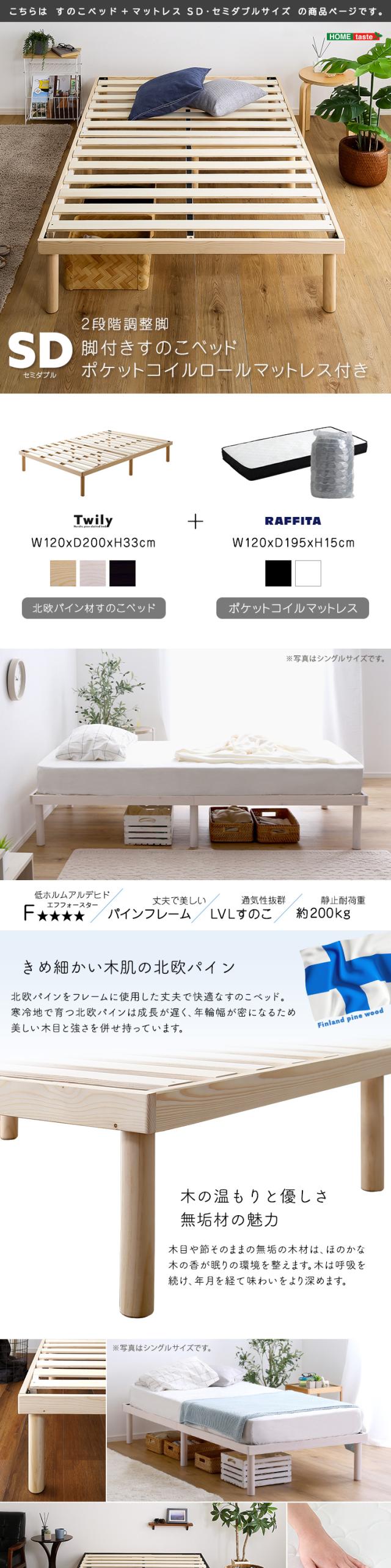 パイン材 高さ2段階調整 脚付き すのこ ベッド ポケットコイル マットレス セット セミダブル サイズ 天然木 北欧パイン セミダブルベッド ベッドフレーム 家具 引越し 新生活 ASP-SRM-SD