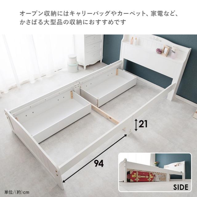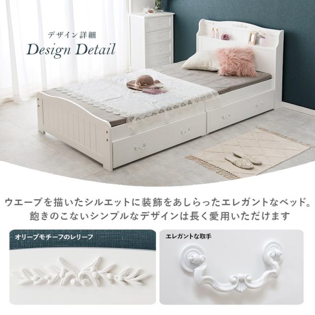 ウェーブを描いたシルエットに装飾をあしらったエレガントなベッド。衣類や小物などを収納できる引出し付き