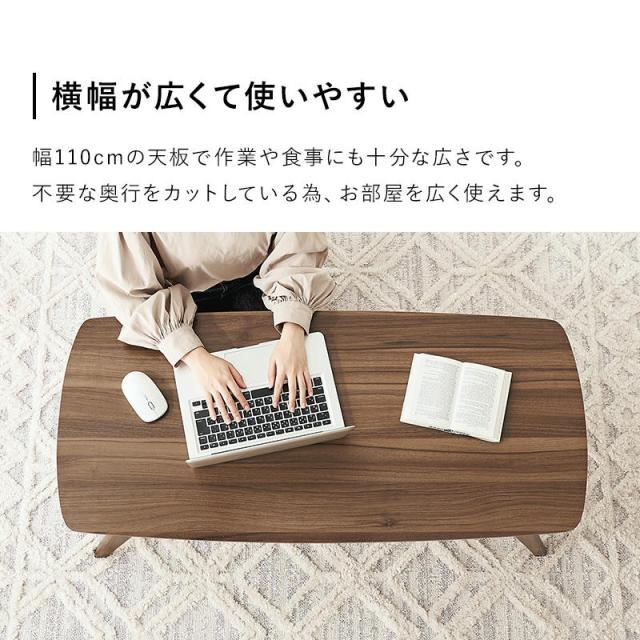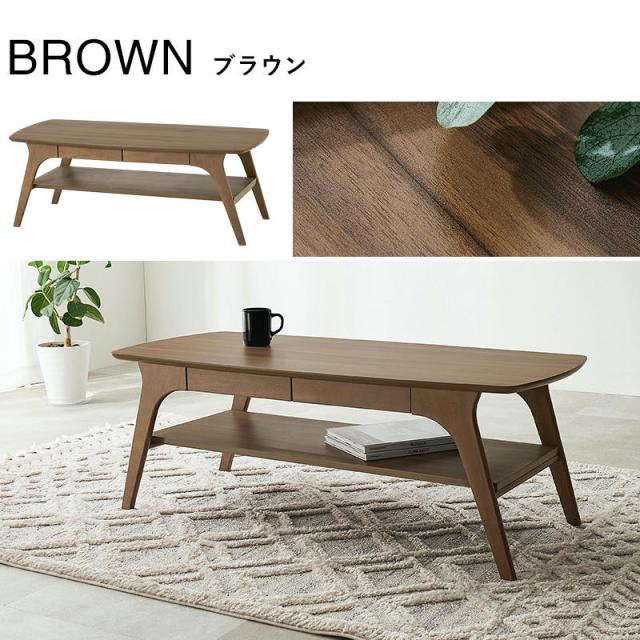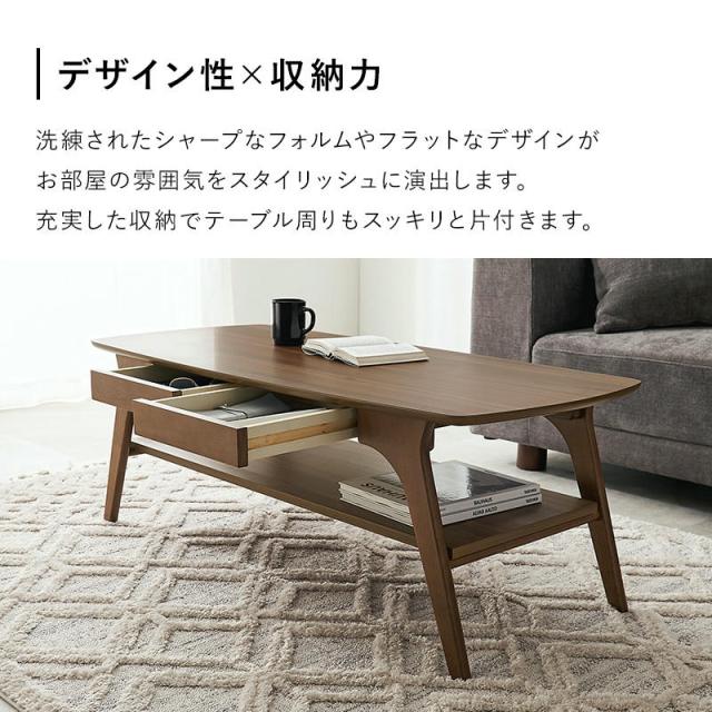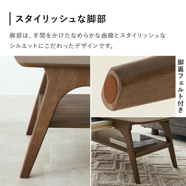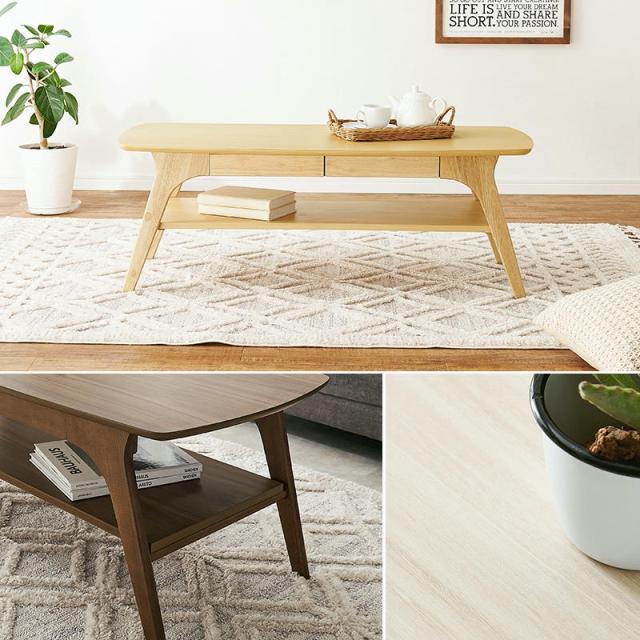 なめらかな曲線とスタイリッシュなシルエットにこだわった木目調のセンターテーブル。幅広で作業もしやすく、便利な引出しと取り外し可能棚付き。
