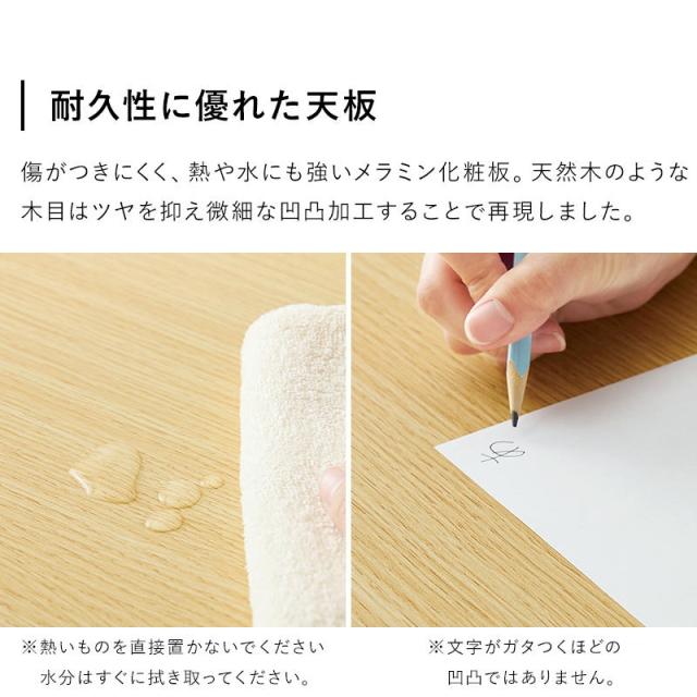 ■天板:合成樹脂化粧繊維板(メラミン樹脂)、本体:ラバーウッド