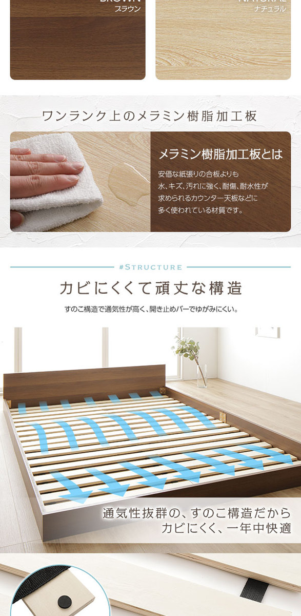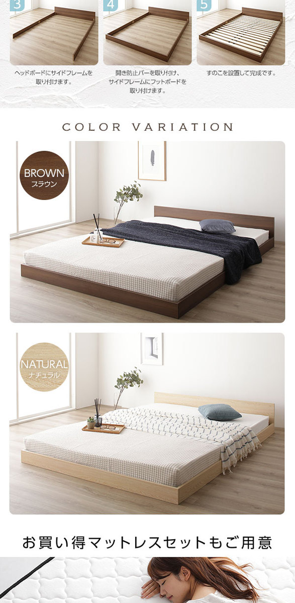 すのこ仕様 ロータイプ ベッド 省スペース フラットヘッドボード ブラウン セミダブル セミダブルベッド ポケットコイルマットレス付き 木製ベッド 低床 一枚板