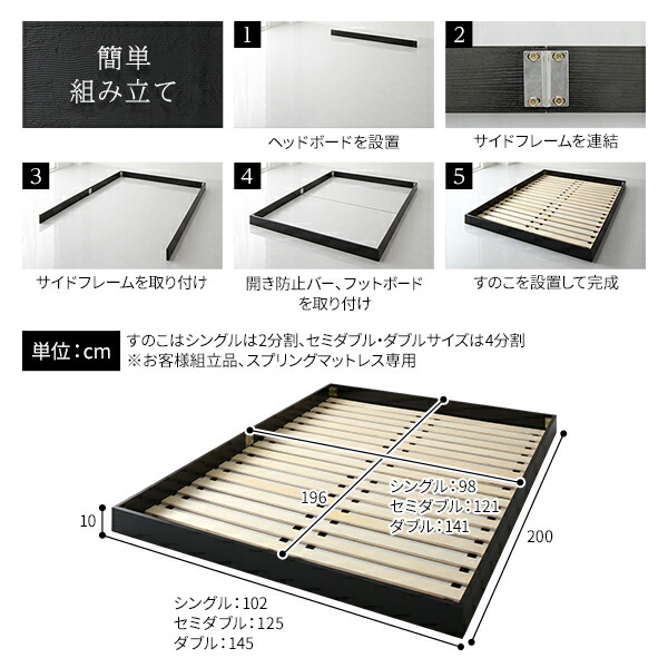 ミニマルデザインが開放感を生み出す。通気性が良くカビにくくい構造のおしゃれなロータイプベッド スノコベッド 低床ベッド 寝室家具 セミダブルベッド