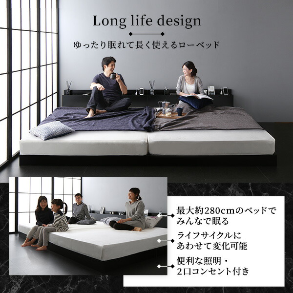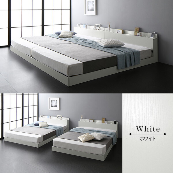 宮棚付き ローベッド 連結ベッド ワイドキングサイズ 280(D+D) ボンネルコイルマットレス付き スノコ構造 ヘッドボード付き LEDライト付き 二口コンセント付き 木目調 頑丈 ホワイト