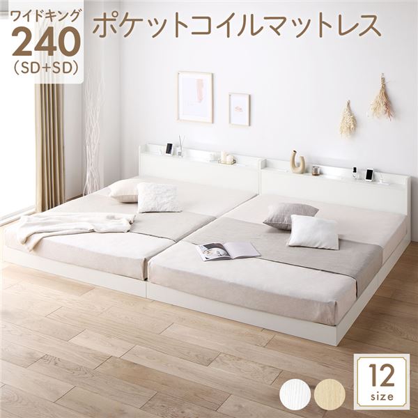 ベッド 低床 連結 ロータイプ すのこ 木製 LED照明付き 宮付き 棚付き コンセント付き シンプル モダン ホワイト ワイドキング240(SD+SD) ポケットコイルマットレス付き