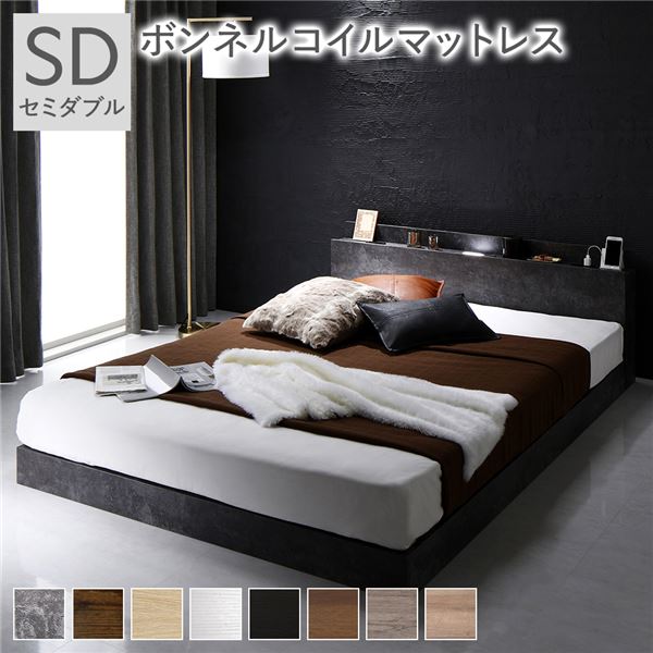 ベッド ローベッド セミダブル ボンネルコイルマットレス付き ストーングレー 低床 すのこ LED 照明付き 棚付き 宮付き 宮棚付き 2口 コンセント付き フロアベッド 低床ベッド すのこベッド すのこベット セミダブルベッド セミダブルベット
