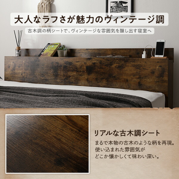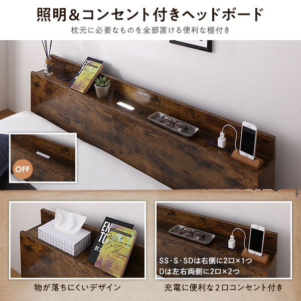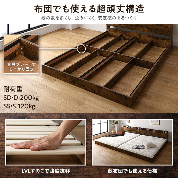 ベッド ワイドキング 200(S+S) ベッドフレームのみ ヴィンテージブラウン 連結 低床 LED 照明付き 宮付き 棚付き 宮棚付き 2口 コンセント付き すのこ 連結ベッド ローベッド フロアベッド すのこベッド すのこベット ワイドキングベッド