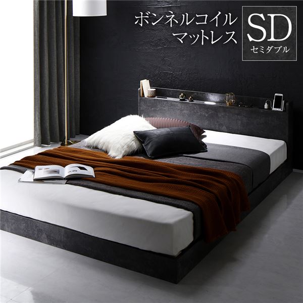 ベッド ローベッド セミダブル ボンネルコイルマットレス付き ストーングレー すのこ 低床 LED 照明付き 宮付き 棚付き 宮棚付き 2口 コンセント付き フロアベッド 低床ベッド すのこベッド すのこベット セミダブルベッド セミダブルベット