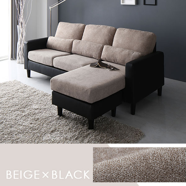 カウチ ソファー セット 〔 3人掛けソファー オットマン ベージュ × ブラック 〕 コンパクト カバーリング クッション付き ローソファー フロアソファー リビング家具 ソファセット