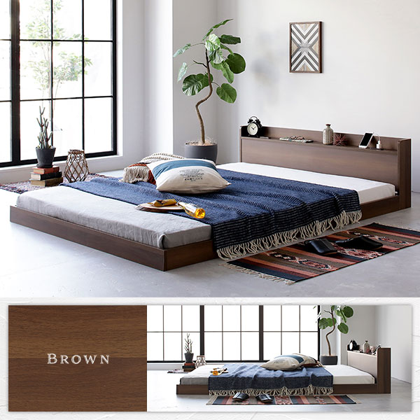 ベッド ダブル 国産ポケットコイルマットレス付き ヴィンテージ ブラウン 低床 棚付き 宮付き 宮棚付き コンセント付き すのこ フロアベッド ローベッド 低床ベッド すのこベッド すのこベット ローベット フロア ベット ダブルベッド ダブルベット